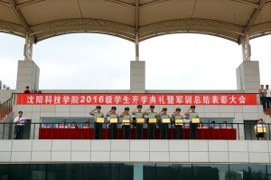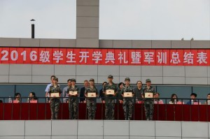 下午2时,新生军训总结大会暨开学典礼正式开始。全体师生高唱庄严雄壮的国歌过后,党总支书记王一女宣读了学校军训团关于表彰“内务卫生优秀寝室”、“军训标兵”、“先进连队”、“优胜营”等集体或个人的命令。主席台上就座的各位领导依次为上前受奖的教官和学生代表颁发了嘉奖令与荣誉证书,并合影留念。