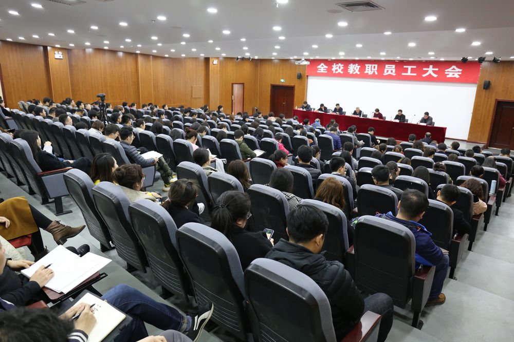 3月20日下午,我校在图书馆多功能报告厅召开了2019年春季学期全体教职员工大会。校领导杨化仁、王一女、张向东、王喜魁、张丽影、杨春光、高洪震出席大会并在主席台前就座;全校各单位、部门主要负责同志和教职员工共计300余人参加了本次大会。大会由副校长张向东主持。