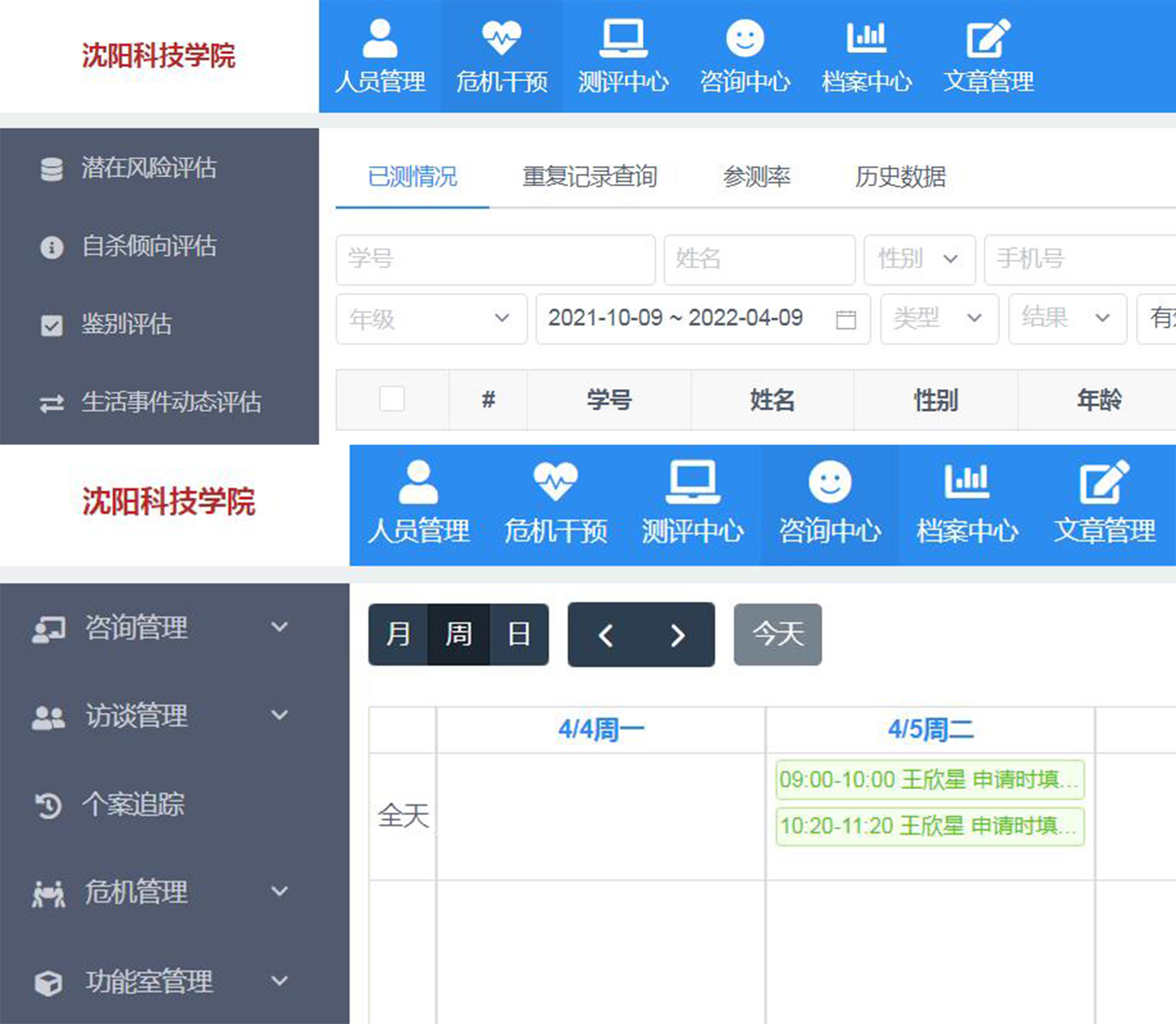由于此次疫情较为严重,学生虽在校却是线上上课,因此心理援助相关的心理危机筛查、一对一援助、团体援助、咨询记录留痕、宣传、讲座等,全部以线上形式进行。我校目前使用心海学生心理危机干预管理系统预警学生心理危机动态、筛查学生心理健康状况、一对一咨询预约,动态记录学生咨询情况。