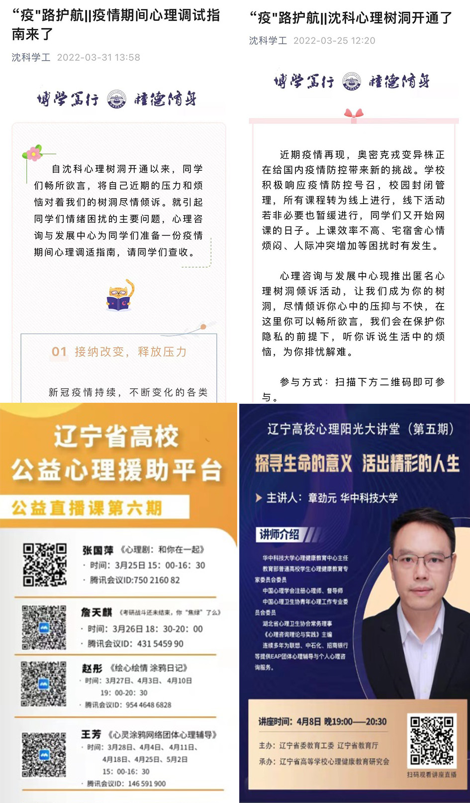 为克服疫情封校期间大学生的心理恐慌,适应线上学习,缓解大学生不确定感和失控感。心理咨询与发展中心举办线上心理树洞、主题团体辅导及发布疫情期间心理调适指南等,并宣传和引入省级国家级专家心理健康培训和讲座,引导学生培养理性平和的积极心态。