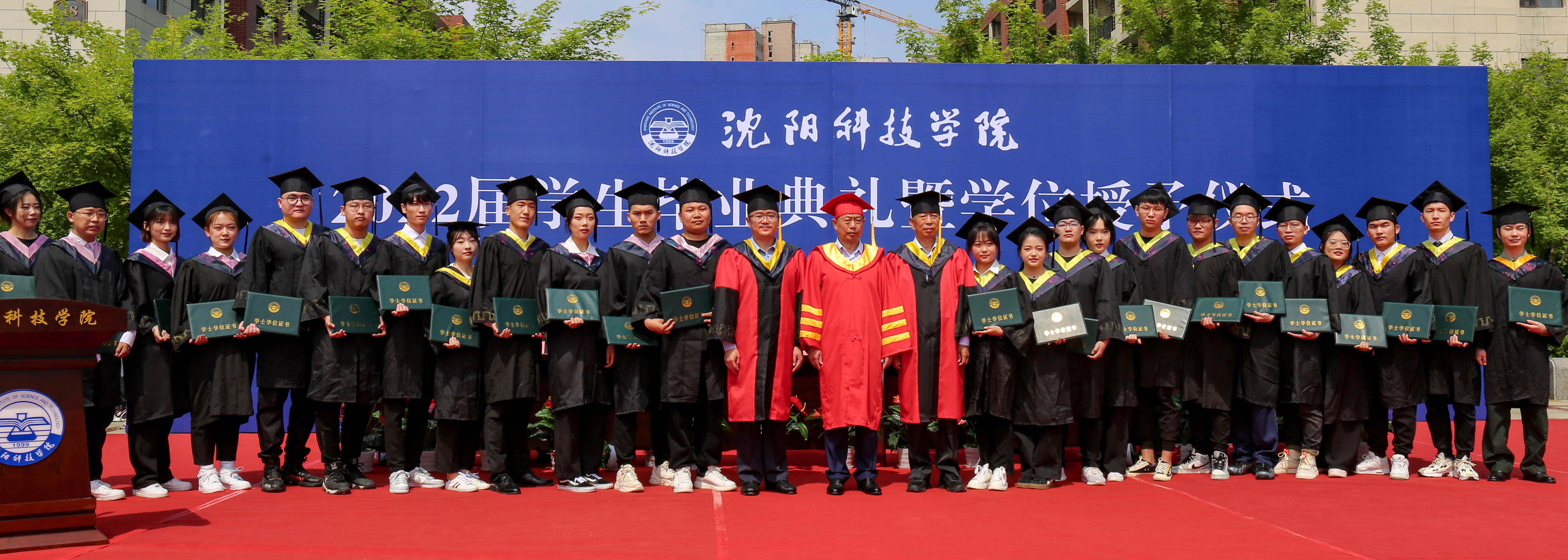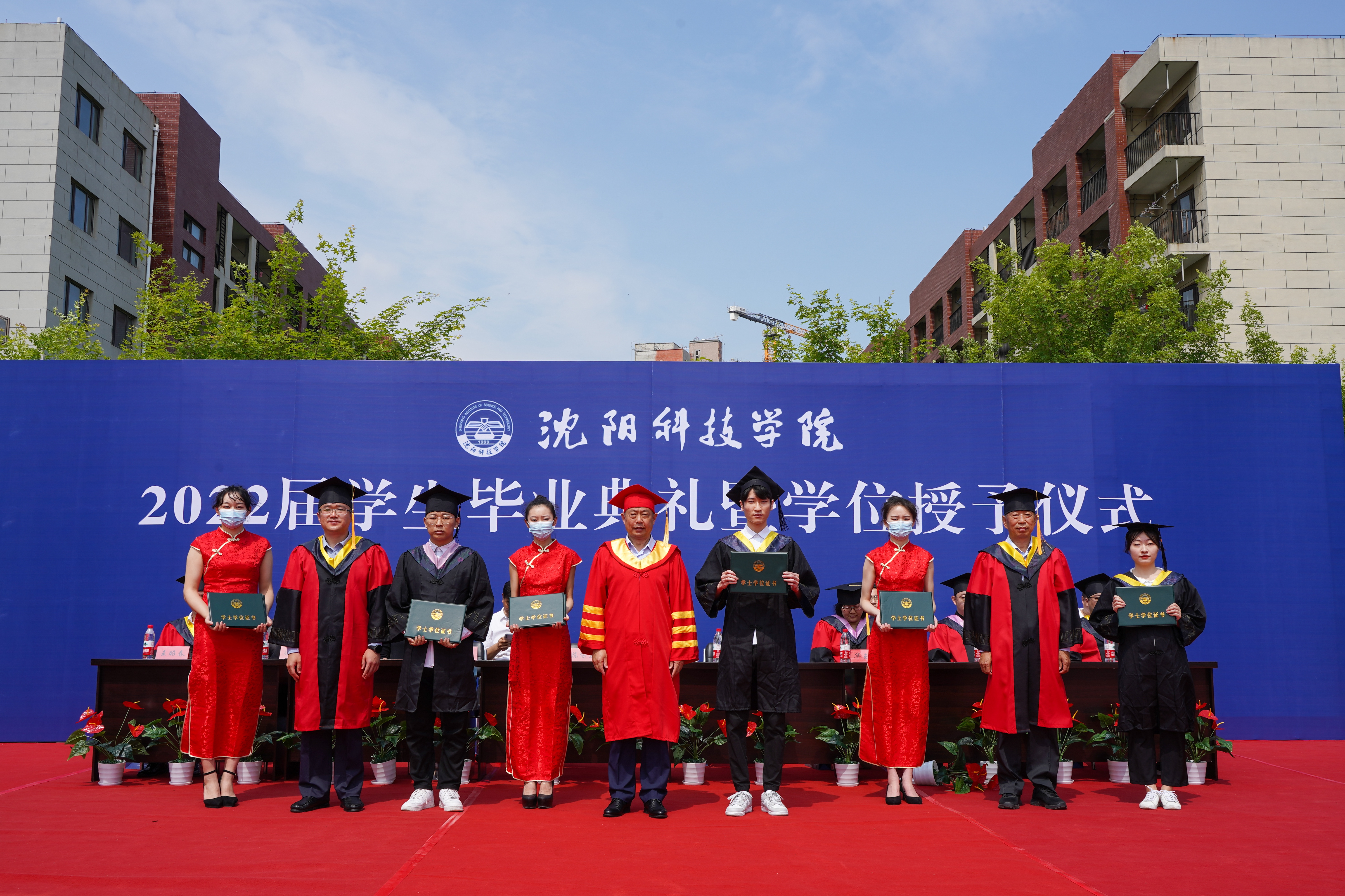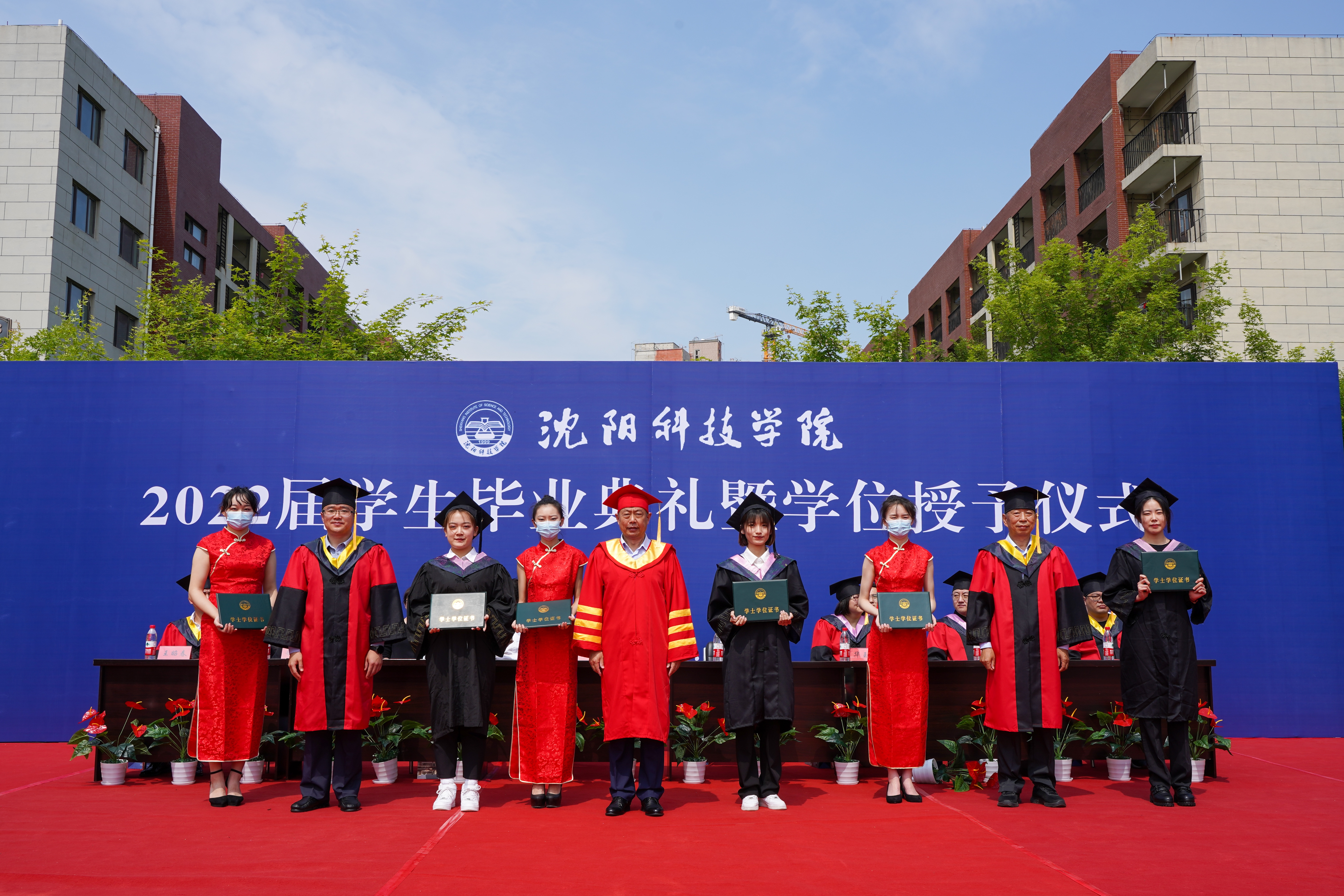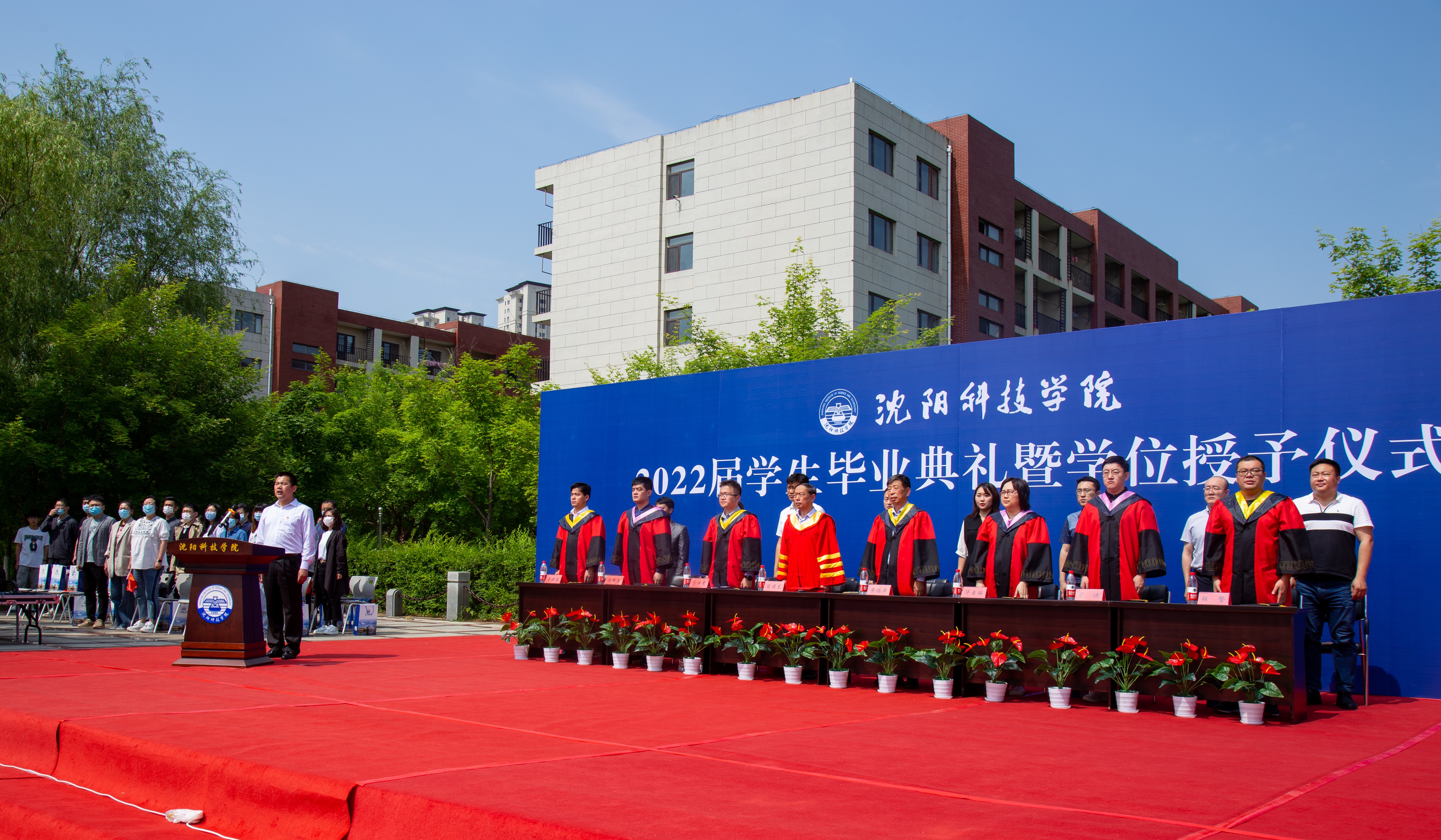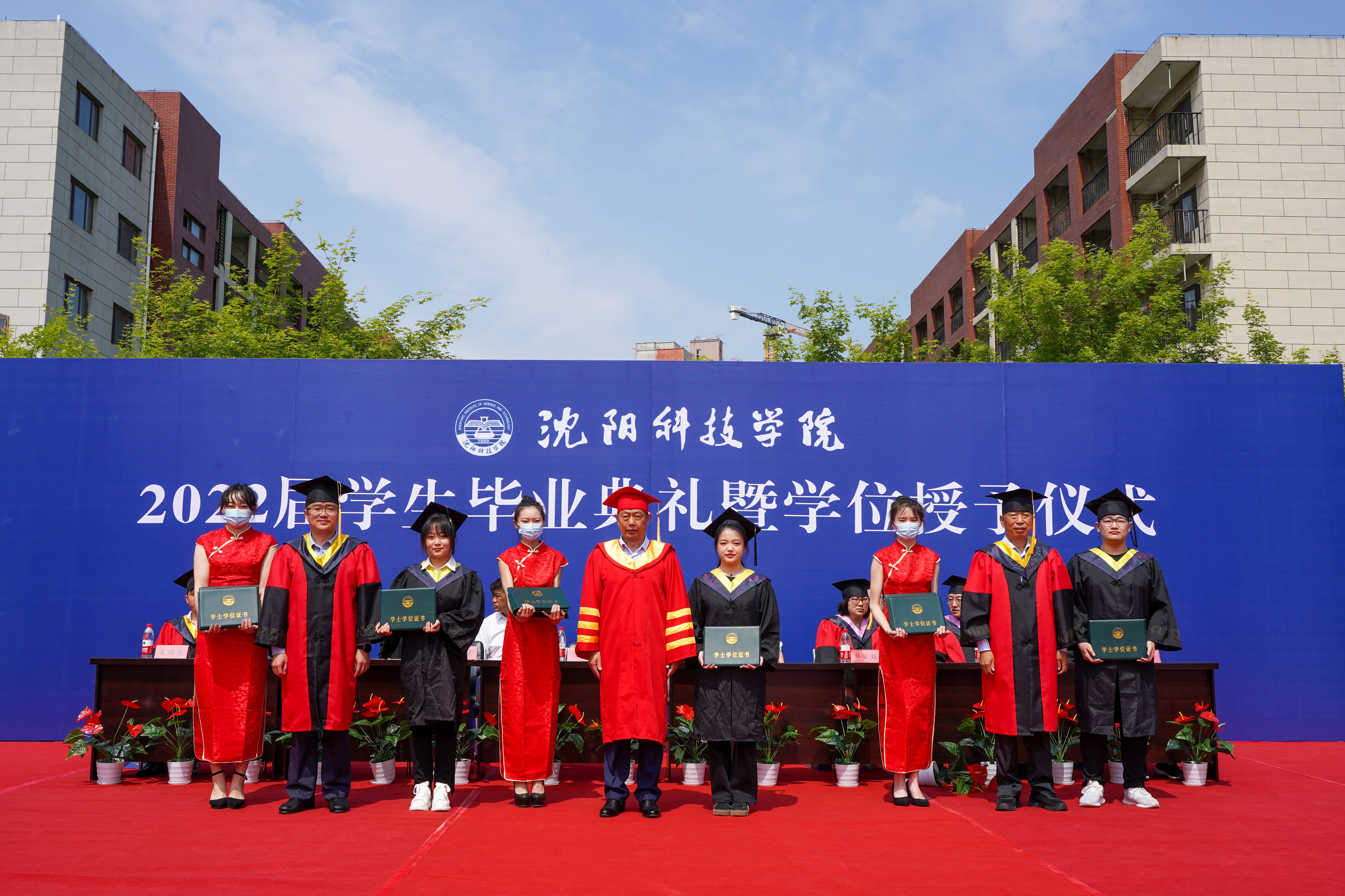 毕业典礼在庄严的国歌声中拉开帷幕。副校长袁德成宣读了2022届学生毕业名单、获得学位名单、校优秀毕业设计(论文)学生名单;副校长高洪震宣读了2022届辽宁省优秀毕业生名单、校优秀毕业生名单。校领导为获奖者颁发证书,并为获得学位的毕业生代表正冠拨穗。