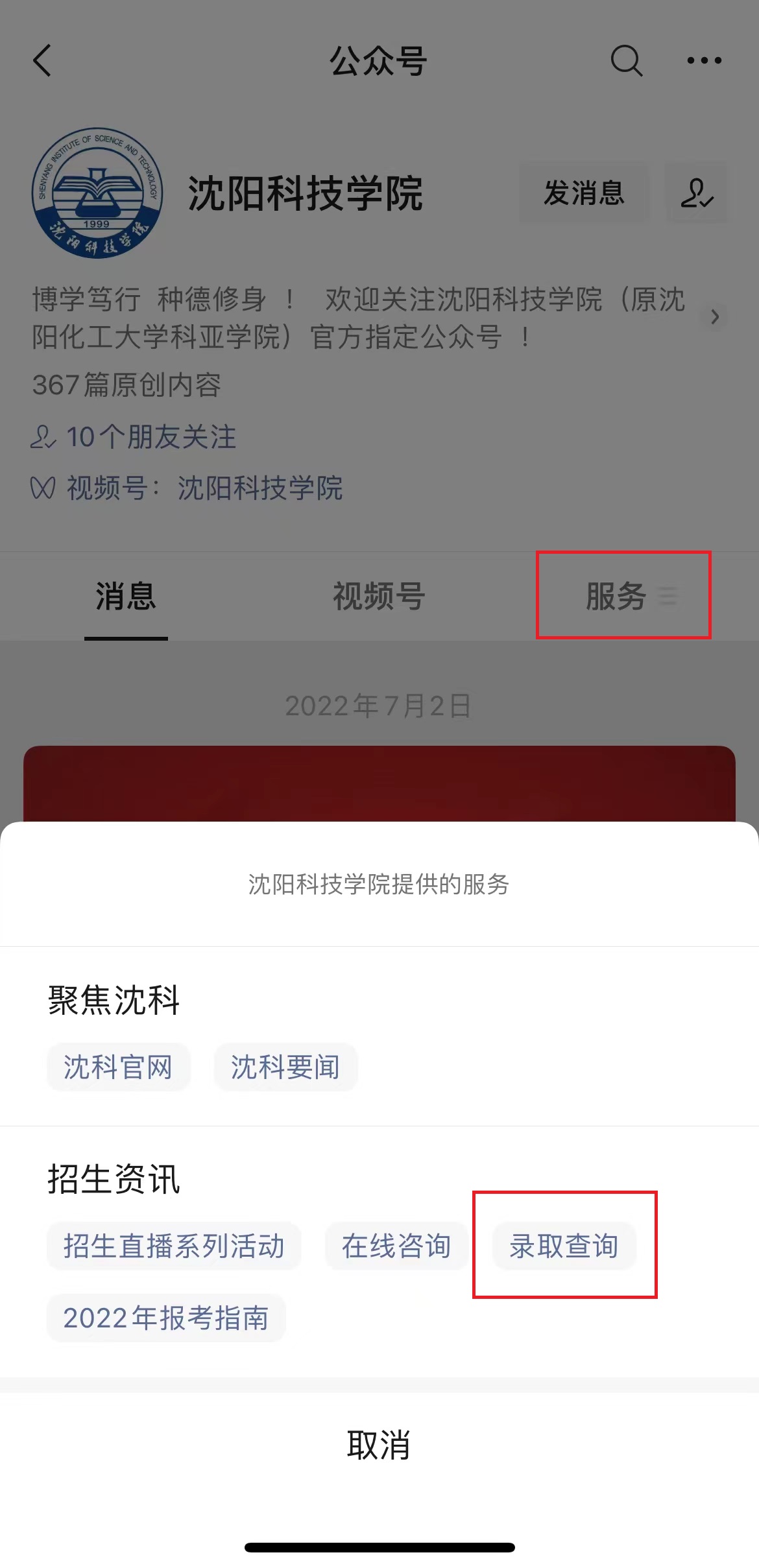 3、校园公众号:考生可搜索我校官方公众号“云鼎官方网址”进入我校官方微信平台,首页屏幕右下角点击“招生资讯”中的“录取查询”,进入查询页面,通过输入“姓名”和“考生号”即可查询录取结果。