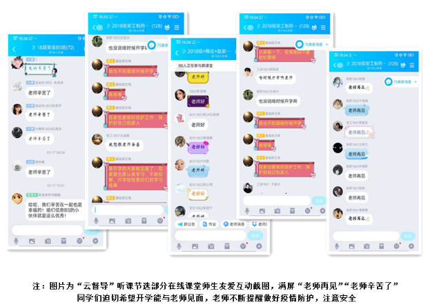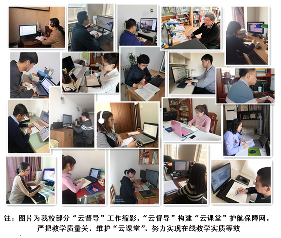 面对在线教学这种全新的教学形式,各级“云督导”主动适应在线教学形式,提前熟悉互联网教学模式,下载各类在线学习软件,以“学生”身份加入课程群组,重点围绕线上教学准备、线上教学模式、线上教学手段与方法、线上教学组织过程、教学互动、学生出勤等方面,实时跟进,线上巡课、看课,构建“云课堂”护航保障网,实现“云督导”教学检查听课全覆盖。