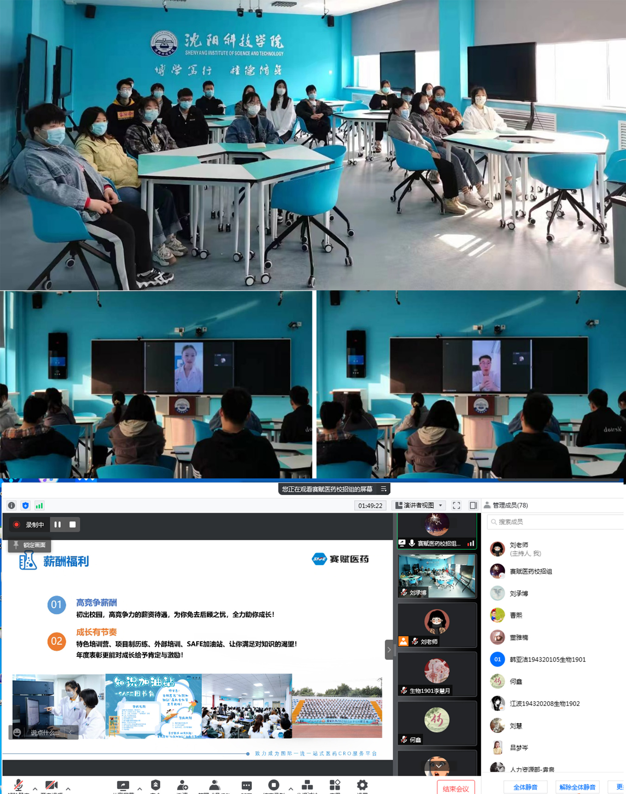 会议上,北京赛赋医药人力资源中心副总经理在线向师生们介绍了企业的总体情况与主要优势;校园招聘负责人通过联网直播,向同学们宣讲了岗位环境等方面内容;我校已前往企业工作、实习的学生分别以视频的形式,介绍了在企工作、实习、生活等实际情况。随后,环境与生物工程系主任刘慧还通过互动系统,向学生介绍了学校同赛赋公司多年来深入合作的历史,帮助引导同学们有效了解就业岗位,有针对性地提升适应与实践能力。