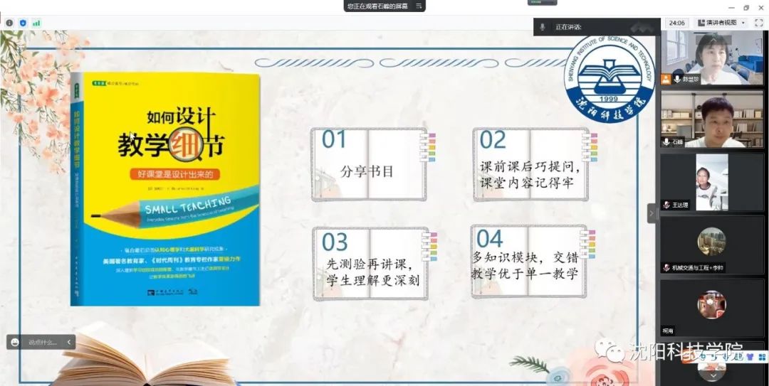第四社区信息与控制工程系学习和阅读《如何设计教学细节》。领读人石峰老师热情分享了“课前课后巧提问,课堂内容记得牢”、“先测验再讲课,学生理解更深刻”和“多个知识模块,交错教学优于单一教学”三部分内容。各位老师受益匪浅,参会的每位老师都针对自己平时的教学,发表了自己的心得体会,大家对不少问题有了新的思考。