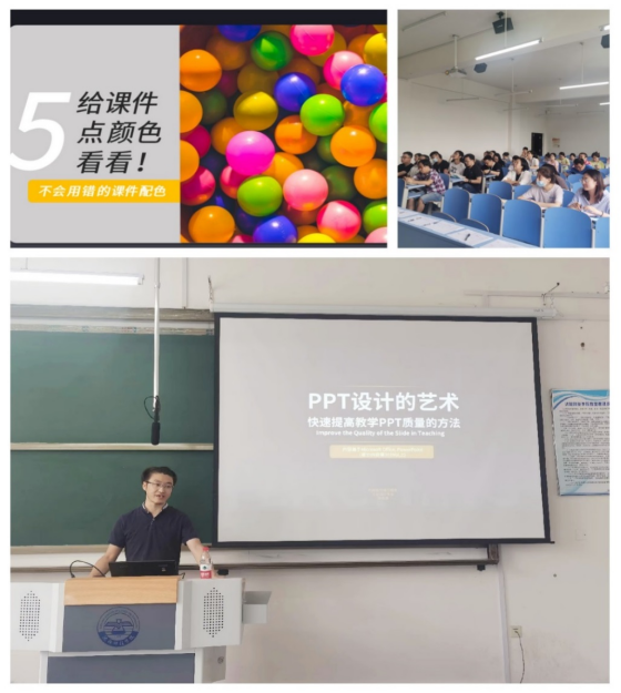 系列活动第一项:由我校机械与交通工程系洪子潇老师为全体青年教师作题为《PPT设计的艺术——提高教学PPT质量的方法》主题讲座。洪老师指出,PPT课件设计应服务于课堂对学生的吸引力、服务于教师和学科的平均需求、服务于效率第一的工作原则。洪老师结合丰富的教学实例,充分调动了青年教师们学习课件制作技巧的积极性,强化了教学课件制作的基本功。