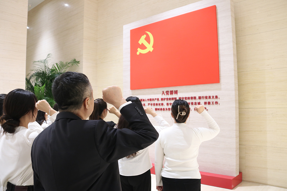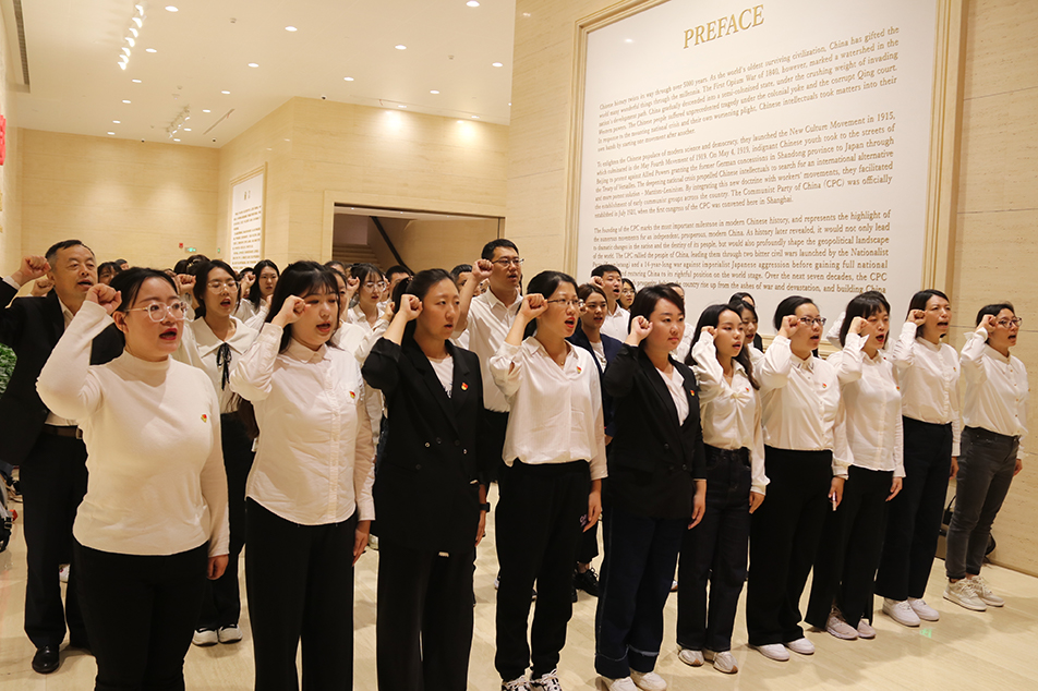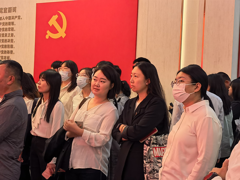 走进一大会址,在鲜红的党旗下,庄严的宣誓墙前,全体参训教师面向党旗,重温入党誓词。