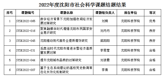 据悉,2022年度沈阳市哲学社会科学立项课题旨在深入学习贯彻习近平新时代中国特色社会主义思想,贯彻落实市党代会、市委全会、市委经济工作会议等精神,进一步整合社科资源,集智聚力,为新时代沈阳全面振兴全方位振兴实现新突破、努力建设国家中心城市服务。我校申报项目均顺利结题,具体名单如下: