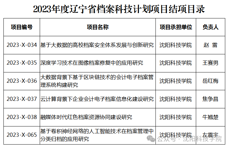 近日,辽宁省档案局发布了《关于2023年度档案科技项目结项的通知》,我校教师申报的《基于大数据的高校档案安全体系发展与创新研究》等6个项目顺利通过验收,获准结项,具体名单如下: