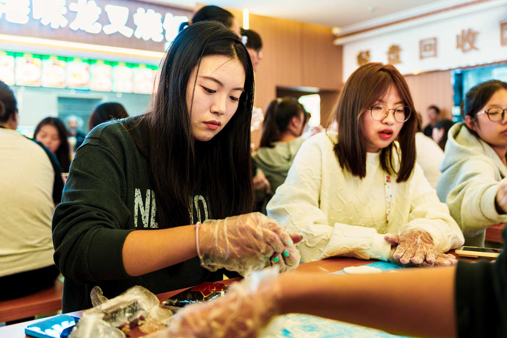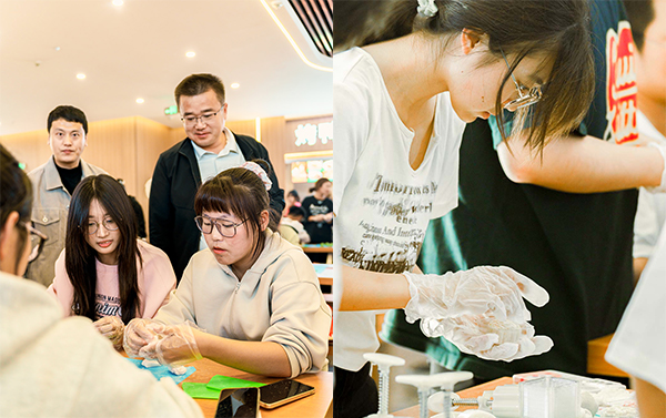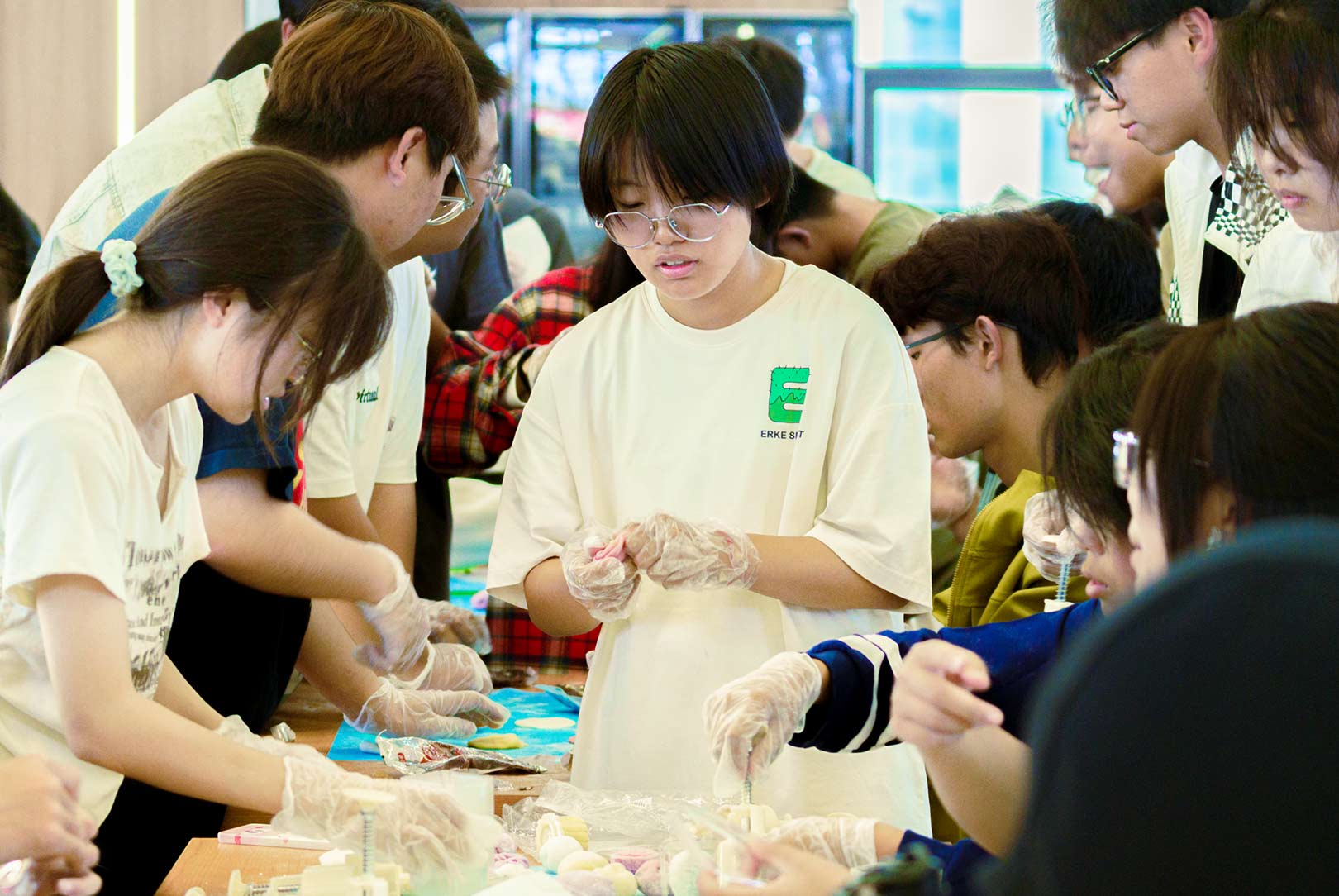 活动伊始,师生齐聚学校食堂三楼,在工作人员的指引下,同学们亲手制作了寓意团圆和美满的月饼,团、压、包、擀,用冰皮面料包裹红豆沙、板栗、黑芝麻、凤梨等陷料,制作一枚枚带有沈科元素的月饼。在欢声笑语中,师生感受着中秋节的欢快气氛与团聚在沈科的甜蜜。