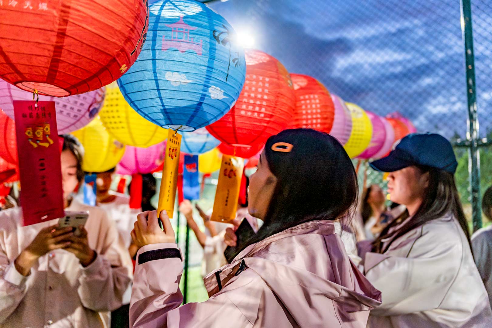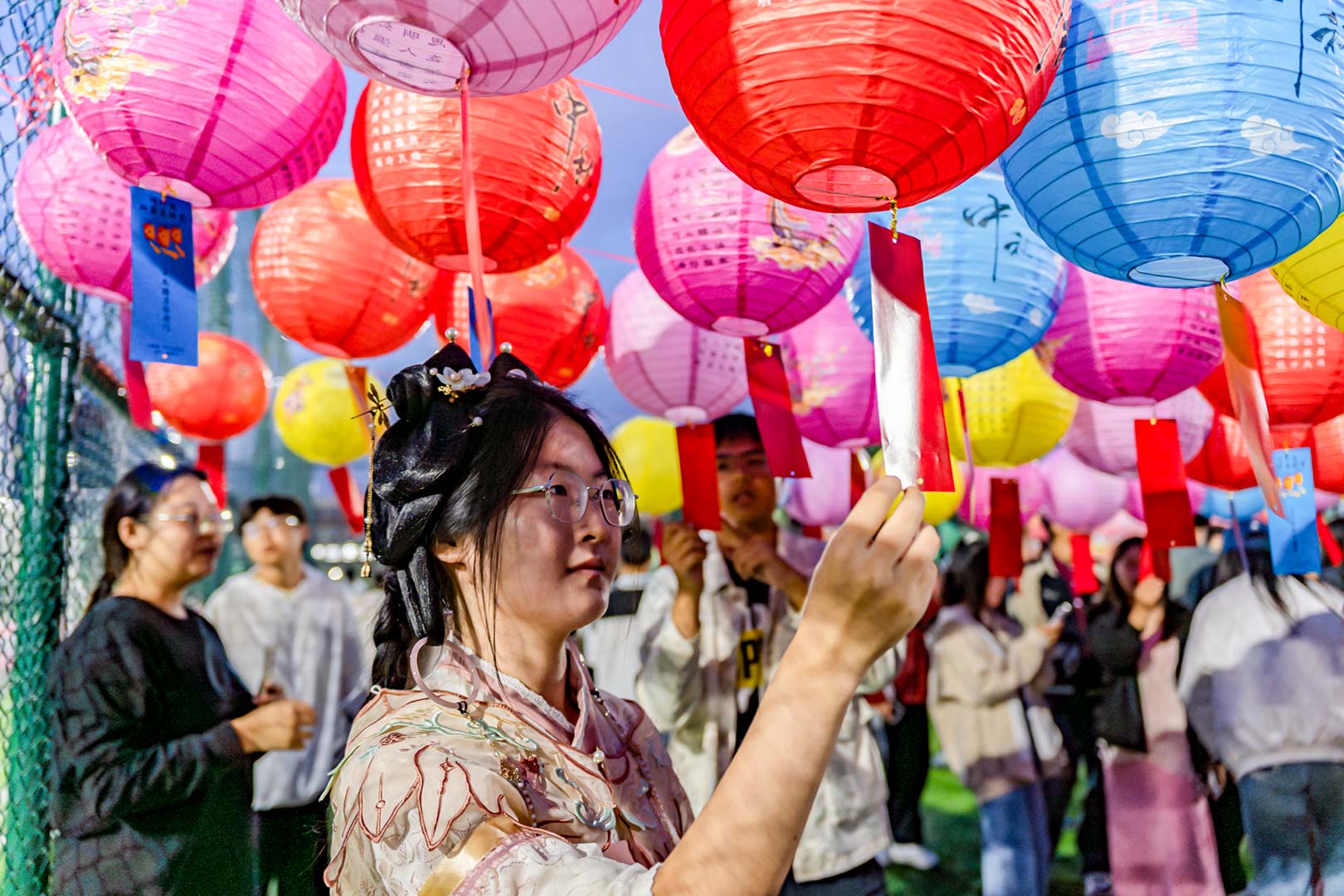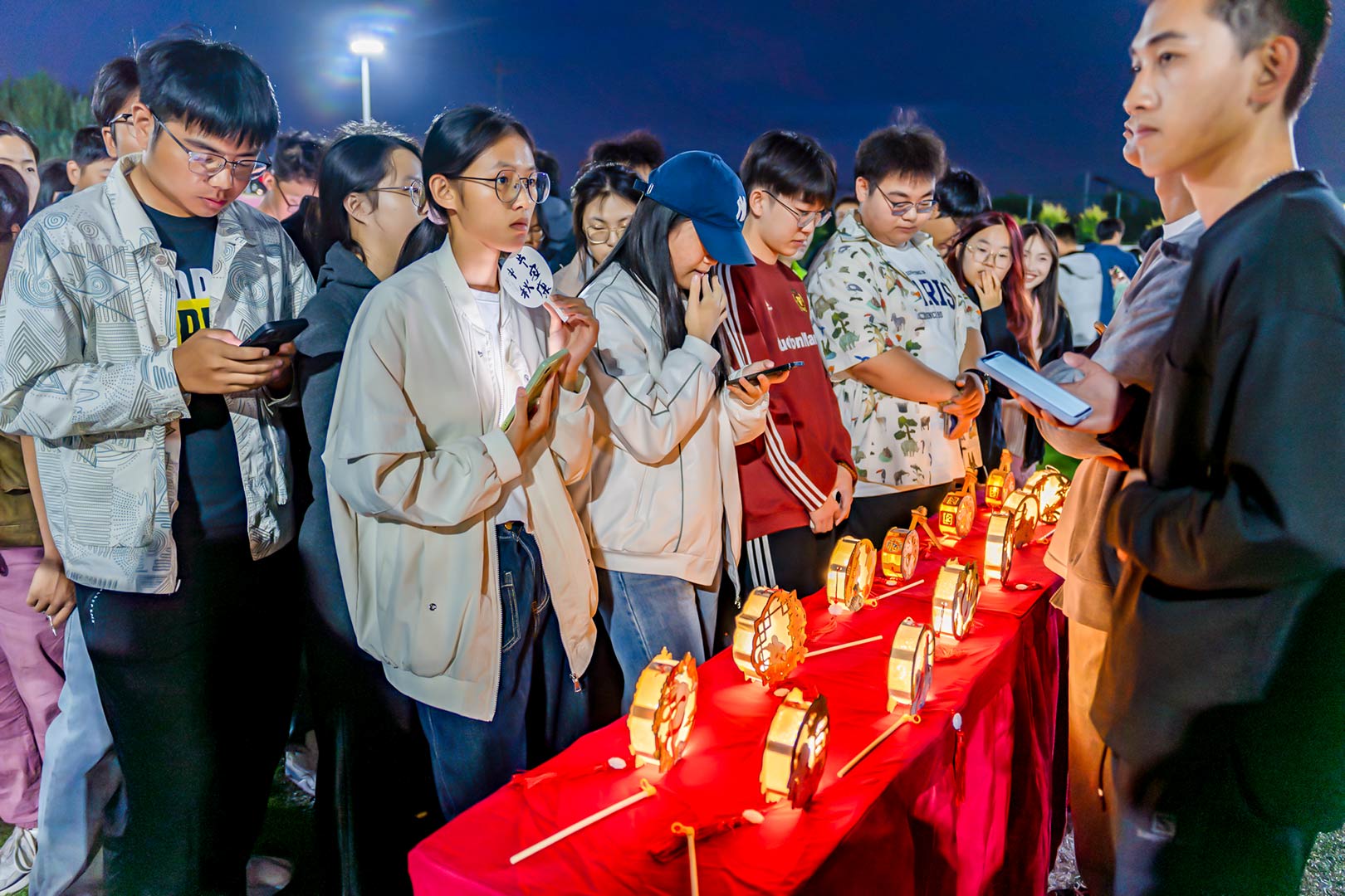 圆月初升,微风徐徐。师生来到足球场,赏花灯、猜灯谜、吃月饼、看表演。一排排谜语随风飘荡,跃于红纸上,大家手持灯谜红纸,一同思考、讨论,争相破解谜底,共享解题的乐趣;静远书斋社的同学们当场创作书法作品,一展笔功,字里行间尽是最真挚的祝福与思念;一曲优美的汉服舞蹈《南乔枝》,婀娜的舞姿步步生花,让人如痴如醉;一曲《如愿》,唱出了对亲人的思念和对未来美好的期盼。