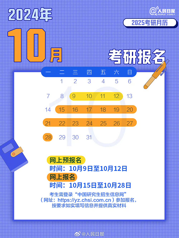 2025年全国硕士研究生招生考试正式报名时间:2024年10月15日至10月28日 每天早9:00—晚22:00