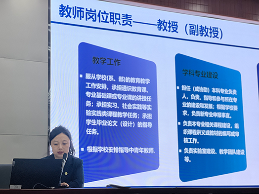 党委教师工作部副部长毕晓月对师德师风规范、学校规章制度、培养考核机制进行了介绍和解读。