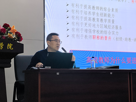 科研处处长卞鹏围绕高校教师如何做好科研工作为题,从科学研究概述、科研选题的方法与技巧、科研立项的申请等方面详细阐述了科研的重要意义。
