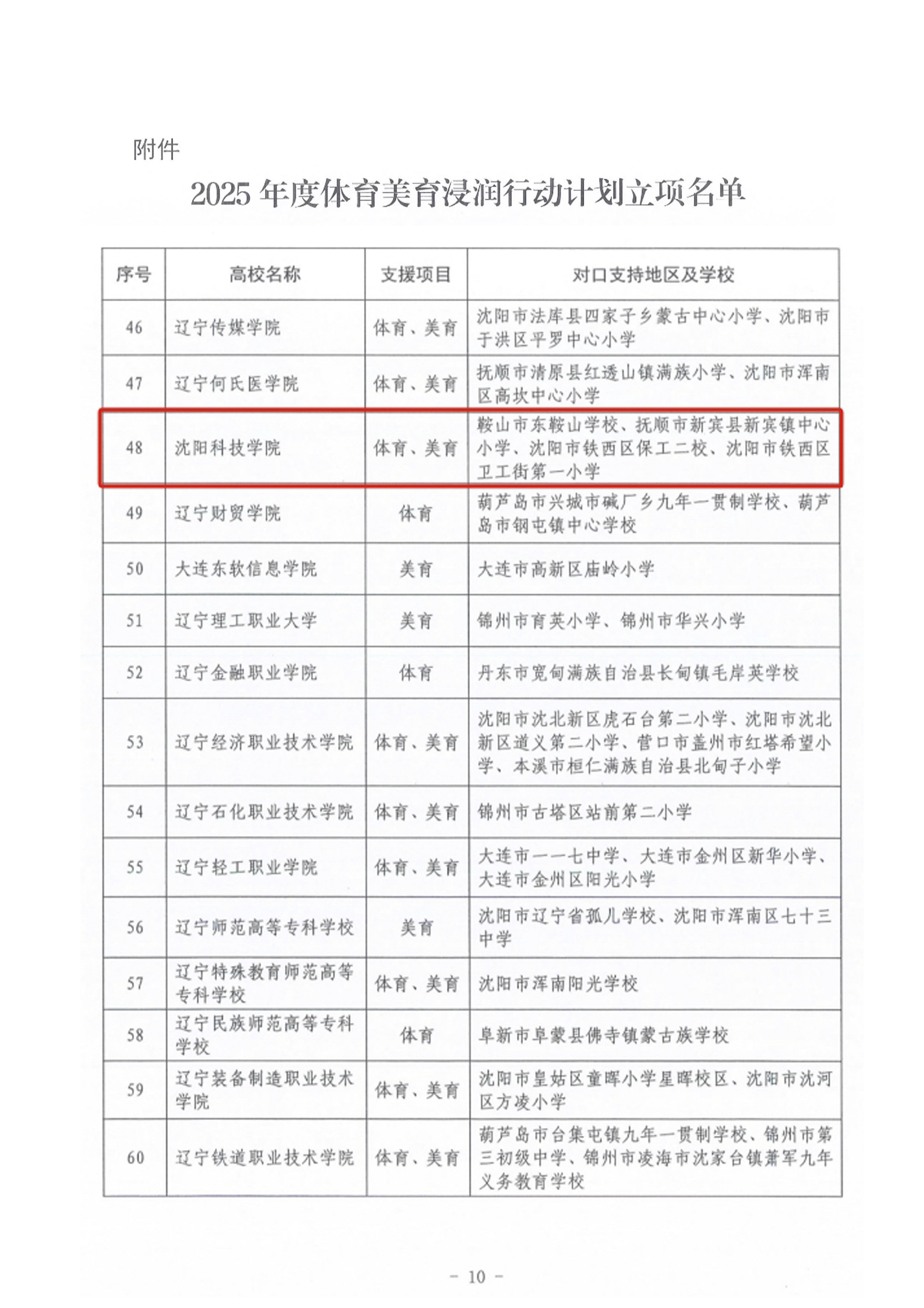 近日,辽宁省教育厅发布了《关于公布2025年度体育美育浸润行动计划立项名单的通知》,我校成功获批该计划立项。根据计划,学校将组织专业的体育美育教师团队,在体育美育课程教学、实践活动、校园文化建设以及教师队伍建设等方面,面向指定的中小学提供定向精准帮扶和志愿服务,充分发挥高校体育美育专业教师和相关专业学生的力量,为中小学校体育美育课程建设及相关教学活动提供有力支撑,推动中小学体育美育日常化、多样化、特色化发展。
