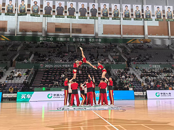比赛间歇期间,队员们身着统一服装闪亮登场,伴随着动感的音乐,以高难度的托举、翻腾和整齐划一的队形变换惊艳全场,点燃了现场球迷的激情,也为紧张激烈的比赛注入了青春正能量,看台上掌声和欢呼声此起彼伏。这场时长3分钟的表演凝聚了队员们一个月刻苦训练的成果,每一个细节与动作都经过了严格的打磨,展现出了极高的专业水准与团队协作精神。
