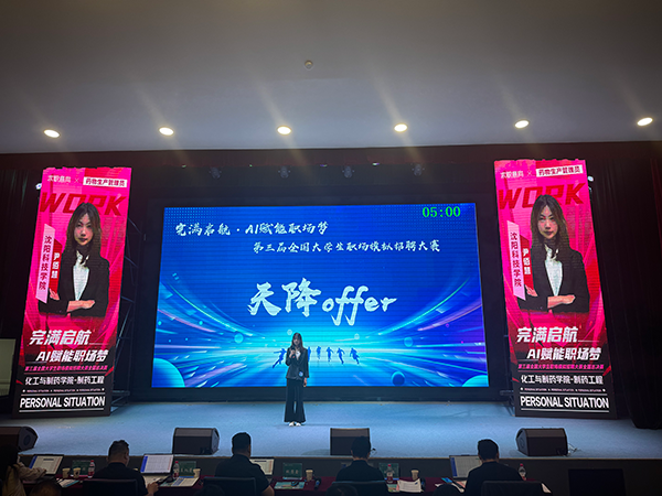 决赛现场,尹佰慧同学以“科学管理 用药精良”为主题,在“主题陈述”“综合面试”“天降offer”三大环节中,从自我认知、行业分析、环境分析、就业规划、评估调整等多方面进行深入阐释,凭借自信地表达、扎实的专业基础以及丰富的实践经验,赢得了在场专家评委的一致认可。