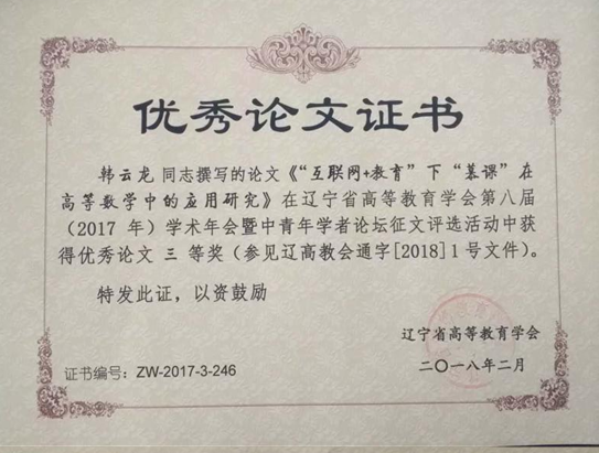 近日获悉,我校教师在辽宁省高等教育学会举办的“辽宁省高等教育学会第八届学术年会暨中青年学者论坛征文评选活动”中获得了优秀论文的好成绩。其中,基础部刘淑霞、刘鲲鹏老师撰写的《基于岗位需求的大学生英语教材建设策略》荣获优秀论文三等奖;基础部韩云龙老师撰写的《“互联网+教育”下“慕课”在高等数学中的应用研究》荣获优秀论文三等奖。